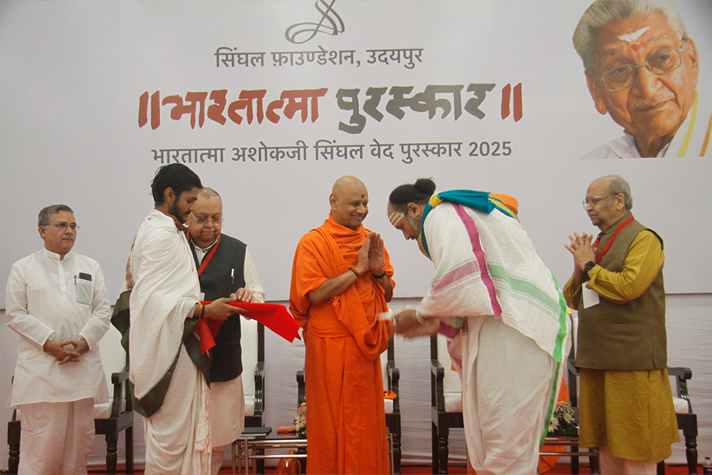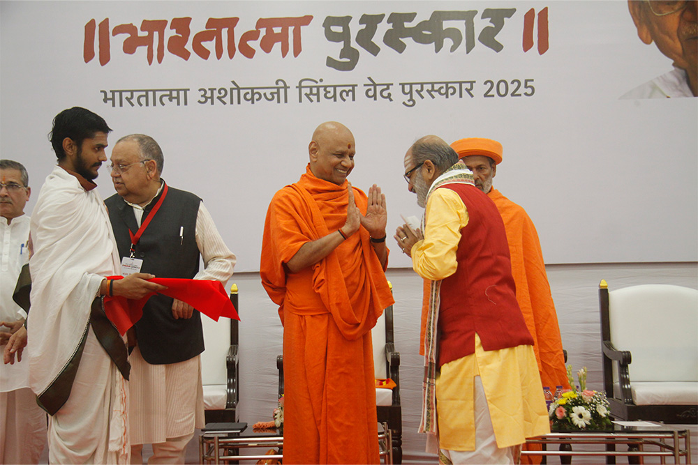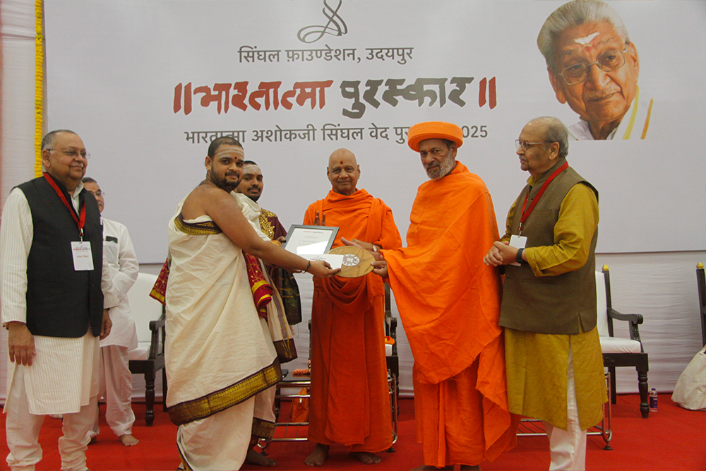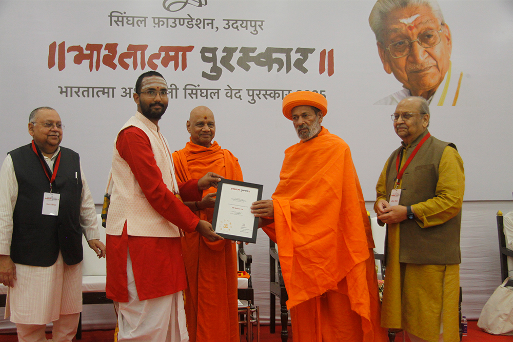 वेदमूर्ति श्री नोरि केदारेश्वर शर्मा, परमपूज्य आचार्य श्री प्रद्युम्नजी महाराज के पावन करकमलों से ‘भारतात्मा उत्कृष्ट वेदविद्यार्थी पुरस्कार’ प्राप्त करते हुए।